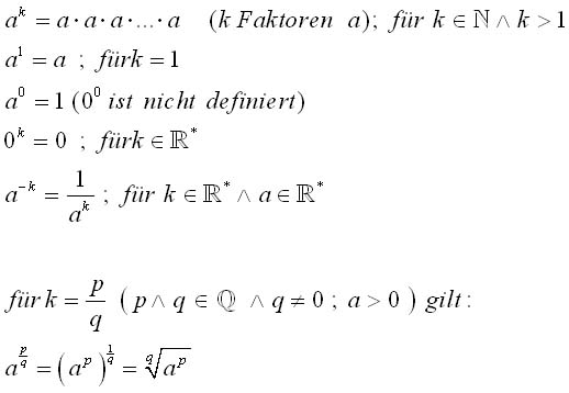 Die Potenzen und Potenzfunktionen sind / waren Gegenstand des Mathematikunterrichts der Klasse 10. Die folgenden Abhandlungen dienen weder zur Erarbeitung noch zum selbstständigen Erlernen. Sie sollen ausschließlich die Reaktivierung des Stoffes erleichtern und einen kompakten Überblick über die Gesetzmäßigkeiten jenseits der Klasse 10 ermöglichen.