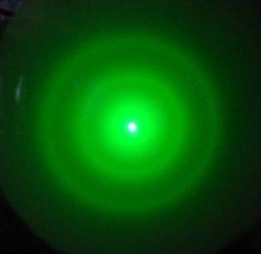 dem Fluoreszenzschirm ist ein deutliches, grün leuchtendes Zentrum zu erkennen, welches konzentrisch von