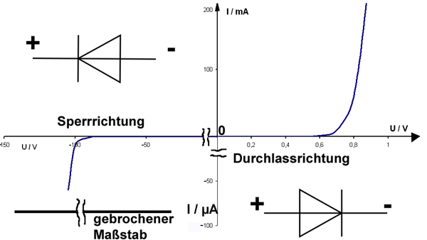 Ab einer einer Spannung von ca. 0,7 V leitet die Diode in einer Richtung den Strom sehr gut leitet. Þ;Durchlassrichtung Ab einer Spannung von ca. 0,7 V nimmt der Widerstand der Diode ab. In der anderen Richtung leitet die Diode den Strom nicht, sie hat einen quasi unendlich großen Widerstand und wirkt wie ein geöffneter Schalter. ÞSperrrichtung BEACHTE, dass die Maßstäbe und Einheiten für Durchlassrichtung (I in mA) und Sperrrichtung (I in µA) der Diode verschieden sind! |