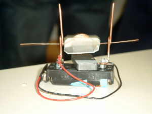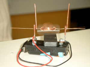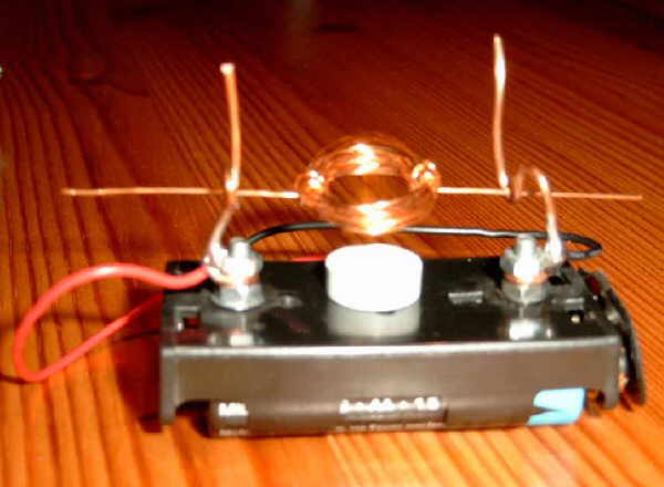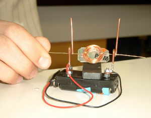 5.  Jetzt legt ihr den Magneten (vgl. Abbildung) auf den Batteriehalter und und legt die Spule in ihre Halterung. Nach einem leichten "Schups" sollte sie sich drehen.