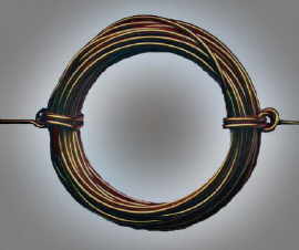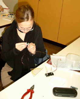 1.  Vom blanken Kupferdraht schneidet ihr 2 Stücke mit einer    Länge von ca. 7 cm zu. Jeweils an einem Ende der Kupferdrähte biegt ihr mit der Spitzzange eine Öse für die Schrauben M3.