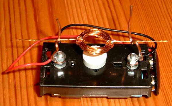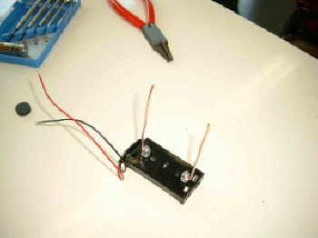 Jetzt lötet ihr die Zuleitung vom Batterieclip an die Aufhängung der Spule, hierbei ist es egal, welchen der Drähte ihr an welche Zuleitung lötet.