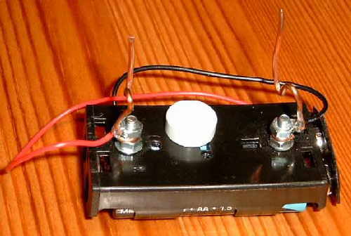 2.  Die Kupferdrähte befestigt ihr nun mit den Schrauben,      Muttern und Unterlegscheiben auf dem Batteriehalter. Der      Kopf der Schrauben befindet sich in der Fachinnenseite, da      ihr sonst die Akkus nicht mehr in den Batteriehalter bekommt. Auch wenn der Aufbau nicht viel zu tragen hat, verwendet unbedingt die Unterlegscheiben, da die recht weiche Plaste vom Batteriefach sonst beschädigt wird.  Außerdem sieht es mit den Scheiben auch viel professioneller aus.