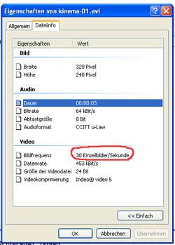 3. Für die weitere Analyse muss die Bildrate (wie viele Bilder werden im Film pro Sekunde aufgenommen) bekannt sein. Diese erhält man durch: