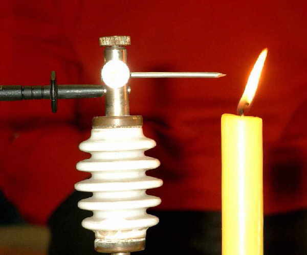 [zurück] [physik] [home] [wegweiser] [rgr] [mathematik] Spitzenwirkung an elektrisch geladenen Körpern Ein Nagel wird in eine Holtzsche Klemme eingespannt und mit dem Bandgenerator verbunden. Die Kerzenflamme wird, wie die Abbildung zeigt, zur Seite abgelenkt. Finde eine Erklärung!