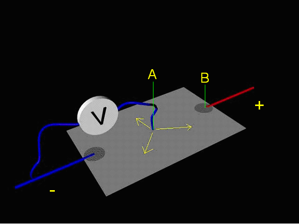Mit dem Voltmeter haben wir Spannungsdifferenzen zwischen A und B festgestellt.