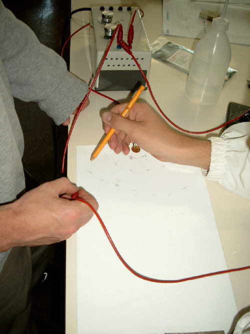 Jedes Papierblatt wurde mit den Alufolie-Figuren an eine Spannungsquelle angeschlossen, so dass die beiden Alufolie-Figuren auf dem Papier unterschiedliche geladen wurden.