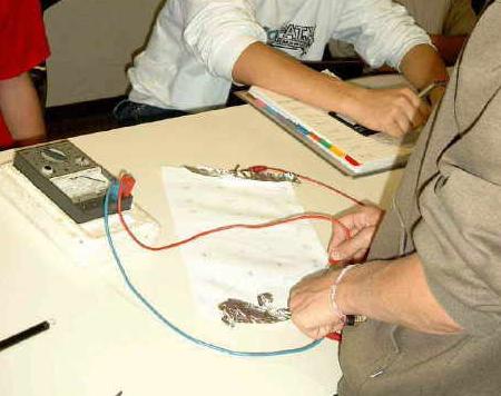 Anschließend haben wir einen elektrischen Pol mit einem Eingang eines digitalen Voltmeters verbunden und an den anderen Eingang des Voltmeters haben wir ein Kabel A angeschlossen (Messsonde), womit wir an verschiedenen Stellen auf dem feuchten Papier Spannungen gemessen haben.
