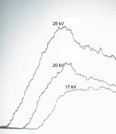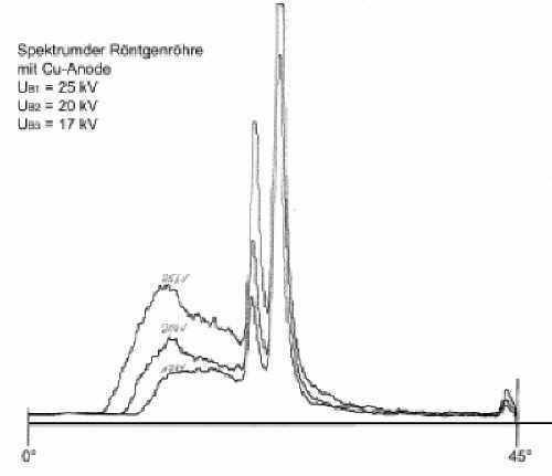 Beschleunigungsspannung von 25kV bzw. 15kV und 10kV erzeugter Röntgenstrahl