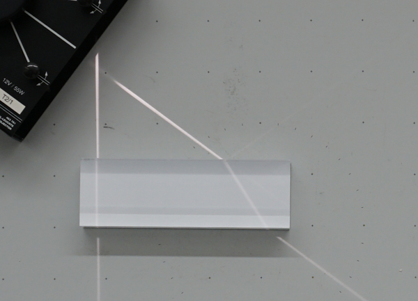 1 fällt senkrecht auf den Glaskörper und wird nicht gebrochen. Luft - Glas: Strahl 2 fällt in einem Winkel von ca. 50° auf den Glaskörper und wird gebrochen. Da Glas optisch dichter ist als Luft, wird der Strahl zum Lot hin gebrochen. Glas Luft: Strahl 2 trifft in einem Winkel von ca. 35° auf die untere Grenzschicht und wird beim Übergang in die Luft gebrochen. Da Luft optisch dünner ist als Glas, wir der Strahl vom Lot weg gebrochen. Da der Lichtweg umkehrbar ist, müssen die Strahlen in der Luft vor und hinter dem Glaslörper parallel verlaufen. Beide Fotos wurden aus exakt der gleichen Position aufgenommen. Zur besseren Sichtbalkeit wurde die Hellikeit im Raum variiert. |