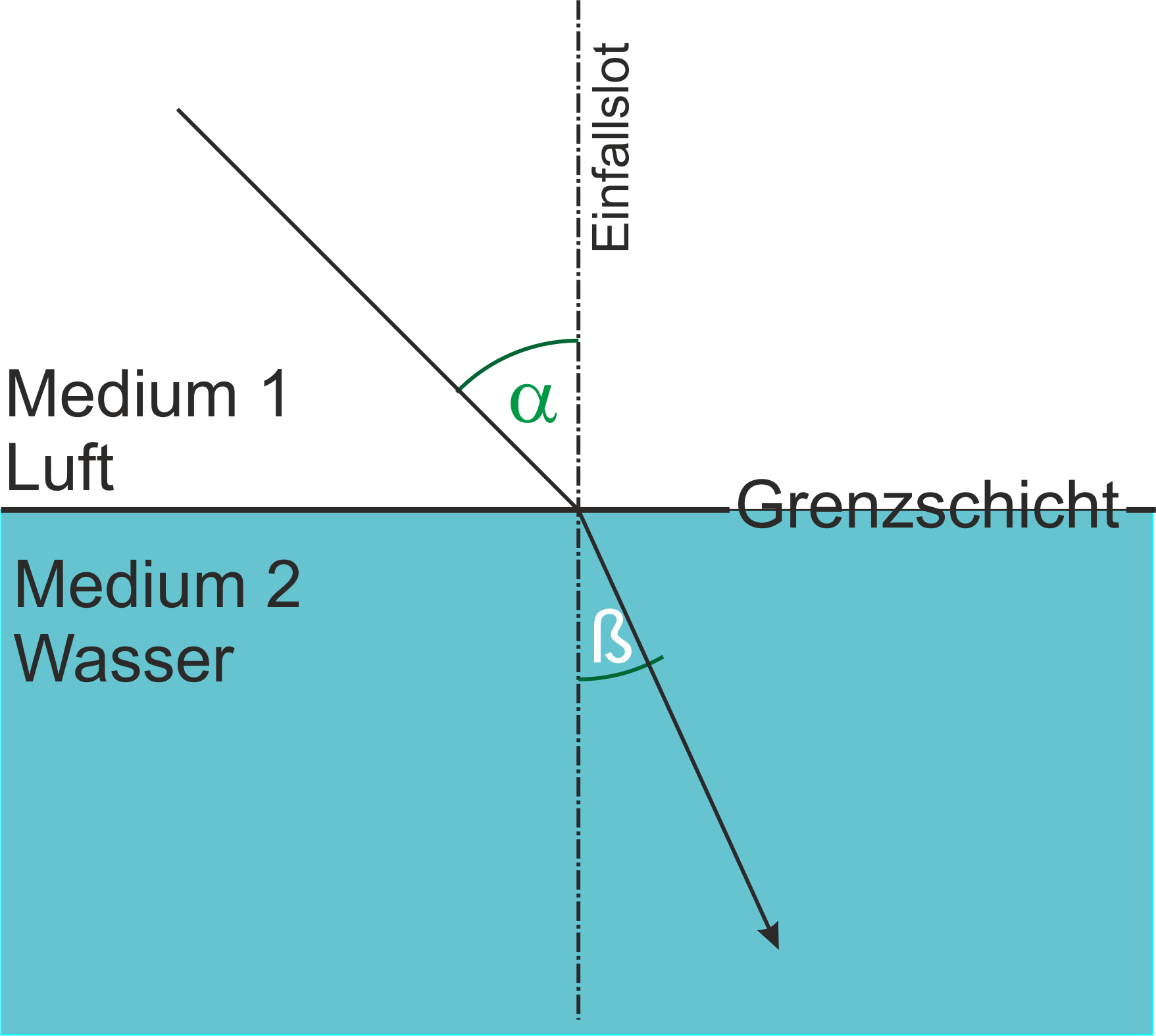 An der Grenzschicht zweier optischer Medien ändert das Licht seine Ausbreitungsrichtung. (Bedingung α ungleich 0°) |
