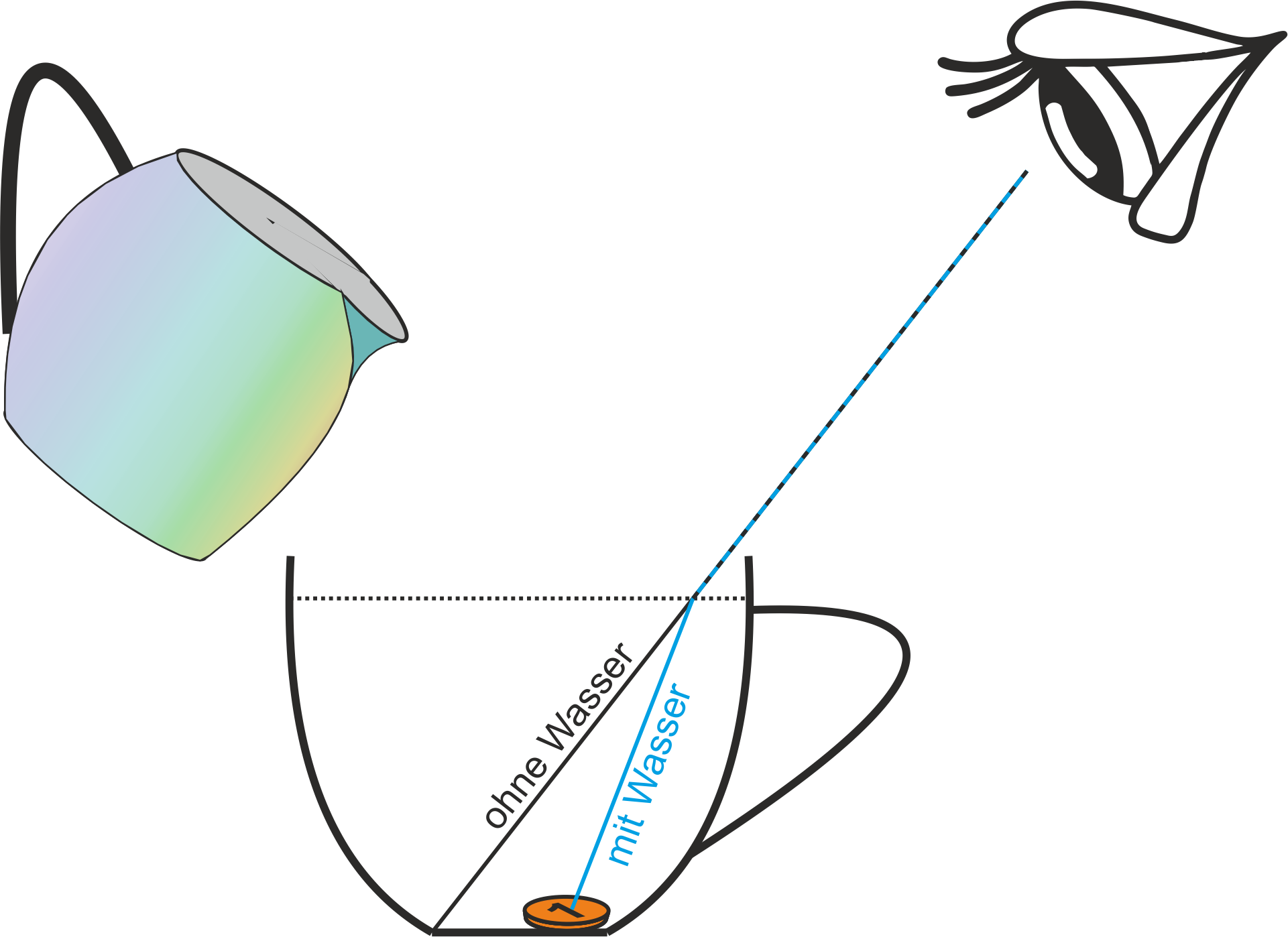 Beobachtung: 1. Bevor das Wasser in die Tasse gegossen wurde, war das 1 ct Stück nicht zu sehen. 2. Je mehr Wasser in der Tasse war, desto mehr konnte man von dem 1 ct Stück sehen. Als die Tasse gefüllt war, konnte man das 1 ct Stück vollständig sehen. Erklärung: