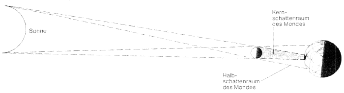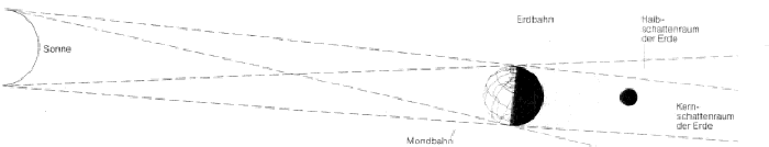 Der Mond umrundet einmal pro Monat die Erde. Dabei verläuft seine Bahn meist oberhalb oder unterhalb des Schattenraumes der Erde. Wenn der Mond jedoch in den Kernschatten der Erde tritt, was sehr selten vorkommt, so wird der Teil des Mondes, der sich im Kernschattenraum befindet nicht von der Sonne beleuchtet. Ist der Mond vollständig im Kernschatten so beobachten wir eine totale Mondfinsternis. Ist der Mond nur teilweise (partiell ) im Kernschatten, so beobachten wir eine partielle (teilweise) Mondfinsternis.